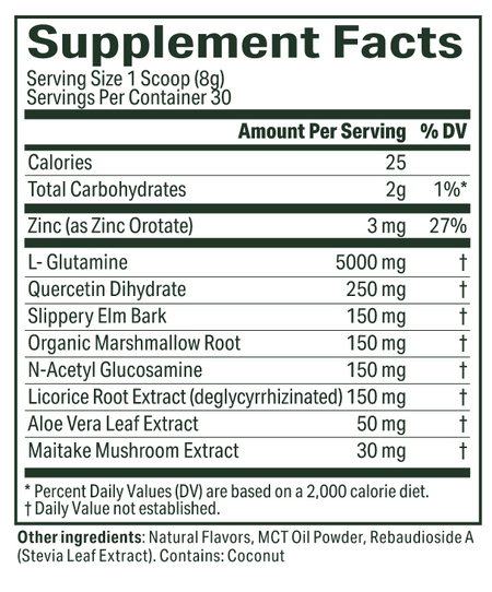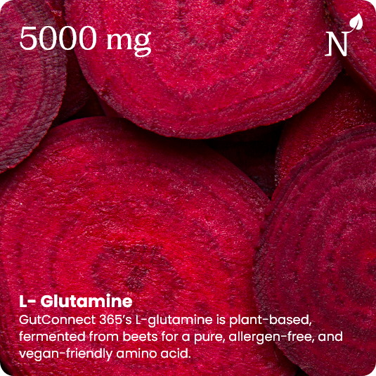 It is an all-in-one gut health solution made with herbal prebiotics, essential amino acids (including L-Glutamine) and 8 all-natural super nutrtients that helps to heal and soothe the gut- lining.
