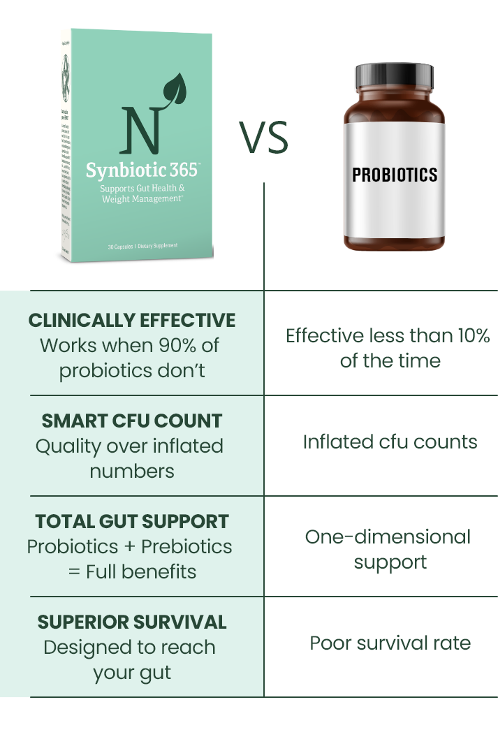 Synbiotic 365 helps support gut health by addressing issues like leaky gut, a condition where the lining of the intestines becomes damaged, allowing toxins and harmful substances to leak into the bloodstream. By restoring balance to the gut microbiome, Synbiotic 365 promotes a healthier gut barrier, reducing inflammation and improving digestion. Additionally, it can aid in weight loss by optimizing digestion, boosting metabolism, reducing bloating, and supporting appetite regulation, which helps you manage your weight more effectively.
